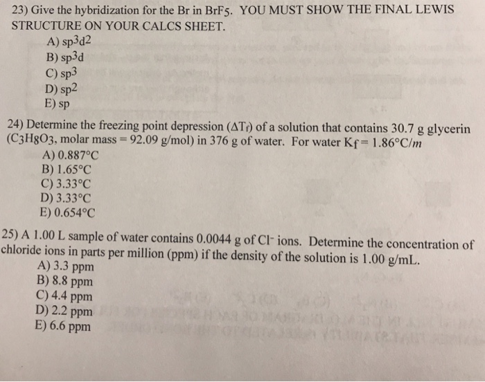 The electron geometry is octahedral, and the hybridization is sp3d2. Give the hybridization for the br in brf5. You must show the final lewis structure on your calcs sheet a) sp3d2 b) sp3d c) sp3 d) sp2 e) sp 24) determine the freezing point depression (at) of a solution that contains 30.7 g glycerin (c3hg03, molar mass 92.09 g/mol) in 376 g of water.