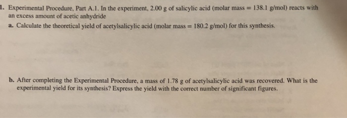 Thus, salicylic acid is limiting and a maximum of 0.0305 moles (5.50 g) of acetylsalicylic acid can be produced in the reaction (theoretical yield), based on a 1:1 molar ratio of salicylic acid to acetylsalicylic Based on the number of grams of aspirin that you synthesized, calculate the number of moles of aspirin that you synthesized. 3 rows enter a chemical formula to calculate its molar mass and elemental composition: