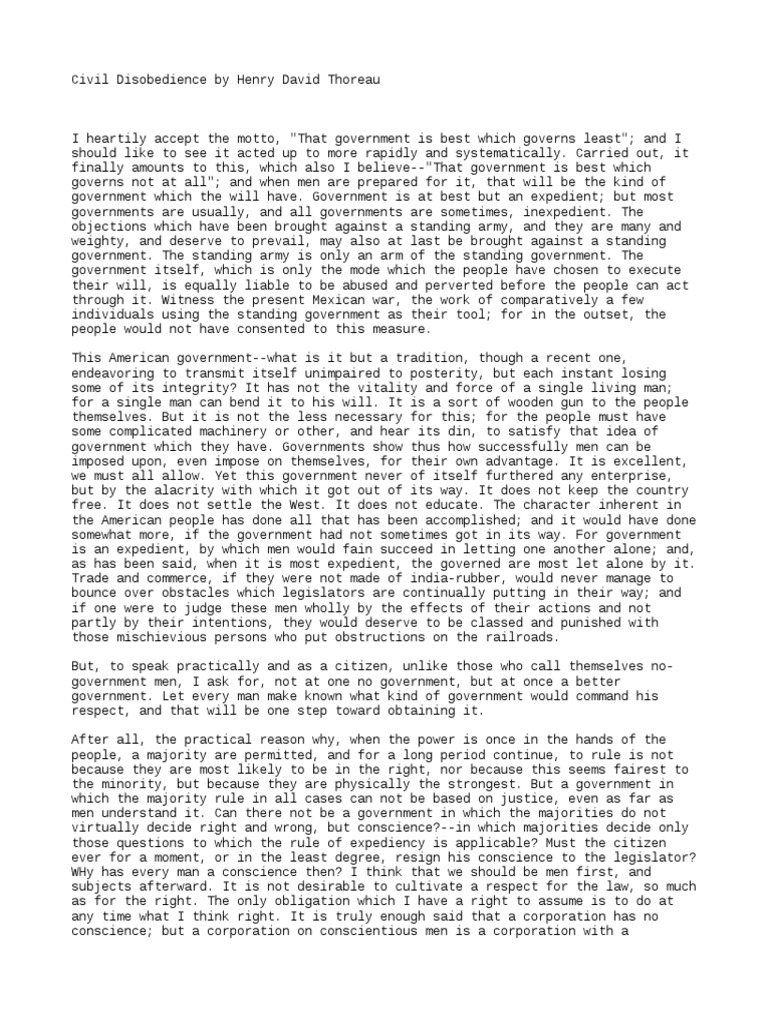 From there, he asks his readers to reflect on the purpose of a standing government such as the one the united. In later years his interest in transcendentalism waned, and he became a dedicated abolitionist. Civil disobedience by henry david thoreau.